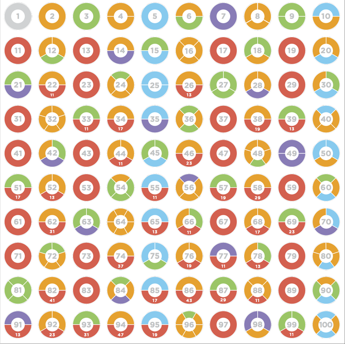 Los números primos aparecen con un solo color y los compuestos con los colores de sus factores primos.